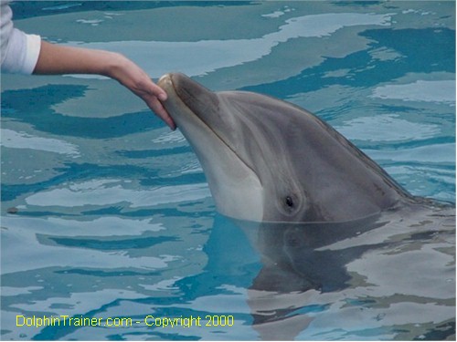 is a very sweet female bottlenose dolphin getting an affectionate chin